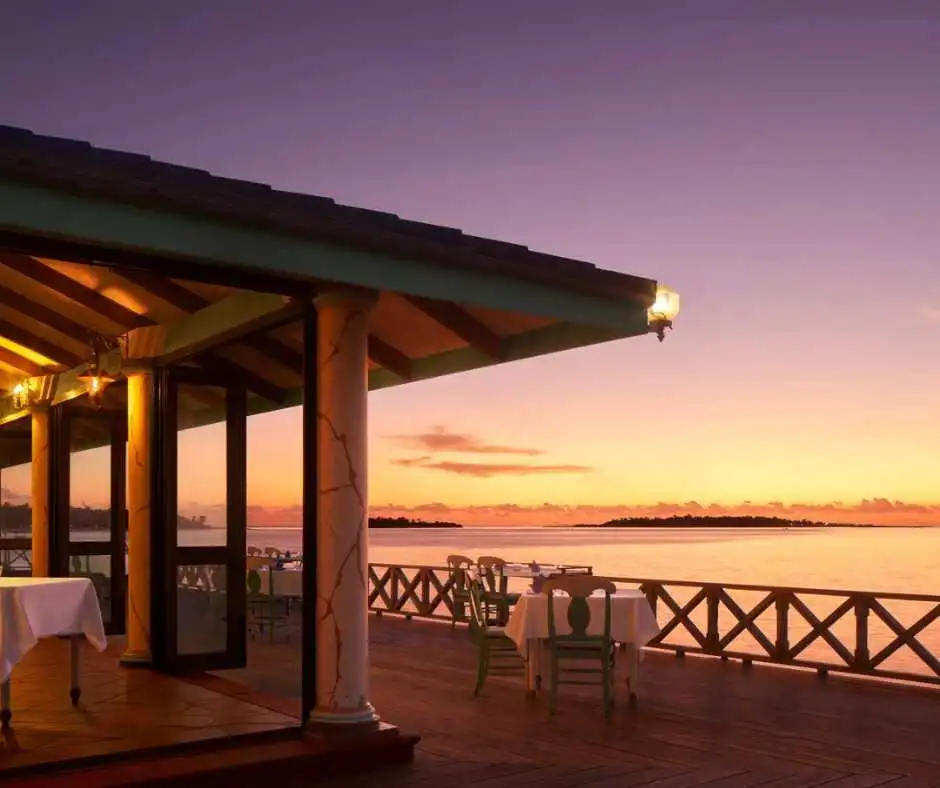 Servono cucina internazionale e autentica delle Maldive, con la possibilità di cenare in camera, al ristorante con vista sull’oceano o in cima agli alberi nella lussureggiante giungla.