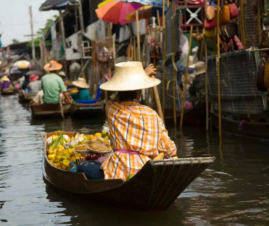 - Tour dei mercati galleggianti vicino a Bangkok, tra bancarelle su barche e colori vivaci.